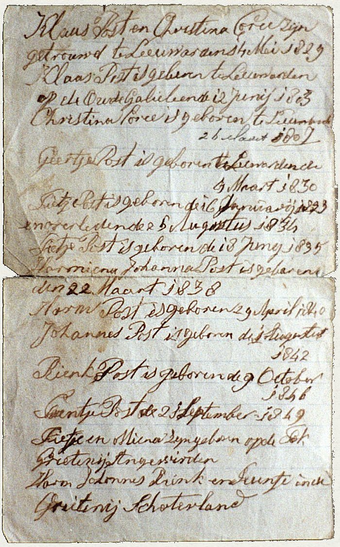 Klaas (Claas) Harmens Post Geslacht:  Geboren: ? Gedoopt: 12-06-1803 te Leeuwarden † Overleden: 10-01-1894 te AEngwirden Begraven: te Heerenveen, algemeen Bijzonderheden: Bij dopen is de naam Claas Harmens Post, later veelal Klaas Harmens Post.Huisbediende bij zijn huwelijk. Het gezin verhuist voor 1833 naar Heerenveen aan de Fok.